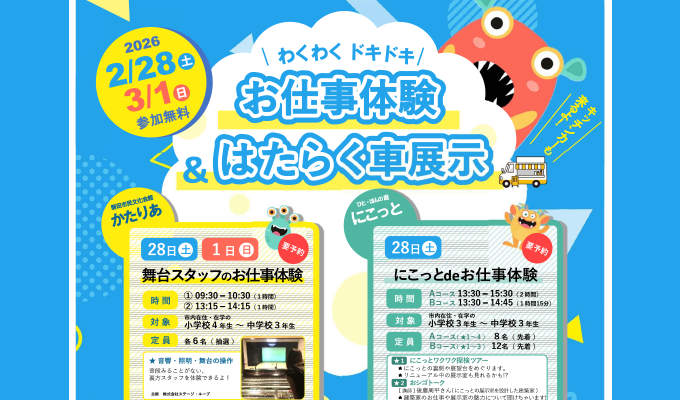 NEWS お知らせ お知らせ 2026.01.30 学生ホールサポーターを募集します! お知らせ 2026.01.28 2/1 飲食店による販売があります! お知らせ 2025.12.02 小学生金管バンド団員募集!(なぎの木金管バンド・かたりあジュニアブラス) お知らせ 2025.12.01 いわたホールガイド 2025 Winter号 発行! お知らせ 2025.09.30 令和8年10月のホール抽選予約空き状況 お知らせ一覧へ EVENT イベント情報 令和8(2026)年2月のイベント一覧 開催日:令和8年2月1日(日)~28日(土) 会場:磐田市民文化会館「かたりあ」 外部開催イベントホール 映画クレヨンしんちゃん超華麗!灼熱のカスカベダンサーズ 上映 開催日:令和8年2月22日(日) 会場:磐田市民文化会館「かたりあ」ホール 市開催セミナーかたりあ 歴史シンポジウム「春風亭昇太と語る秀吉時代の磐田」 ー 磐田市市制20周年記念事業 ー 開催日:令和8年2月23日(月祝) 会場:磐田市民文化会館「かたりあ」 イベント一覧へ LINK リンク