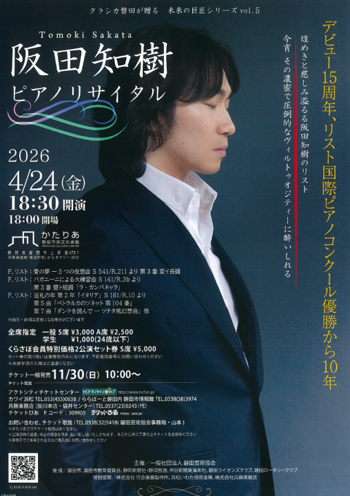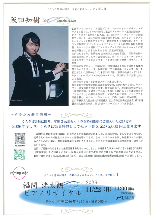 | 問合わせ | 一般社団法人 磐田芸術協会 TEL:0538-32-5418 メールアドレス: classica.iwata@gmail.com |