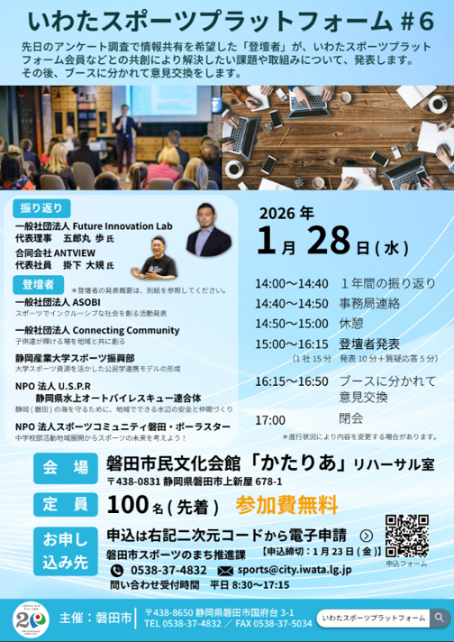 | 問合わせ | 磐田市スポーツのまち推進課 TEL:0538-37-4832 FAX:0538-37-5034 |