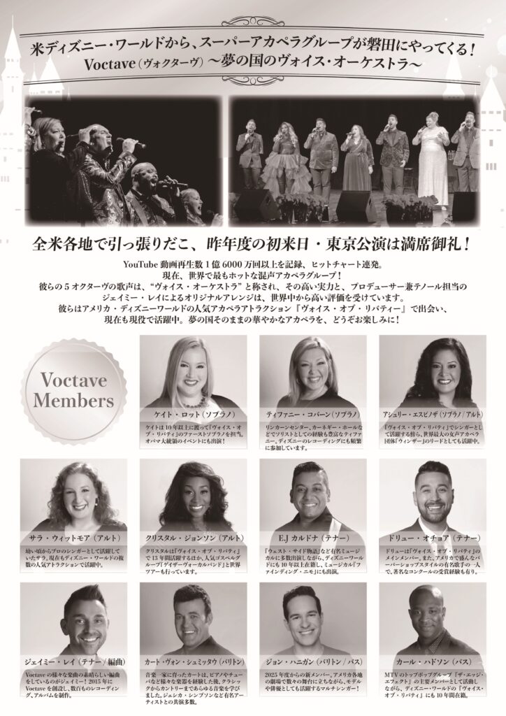 彼らはアメリカ・ディズニーワールドの人気アカペラアトラクション『ヴォイス・オブ・リバティー』で出会い、現在も現役で活躍中。夢の国そのままの華やかなアカペラを、どうぞお楽しみに!